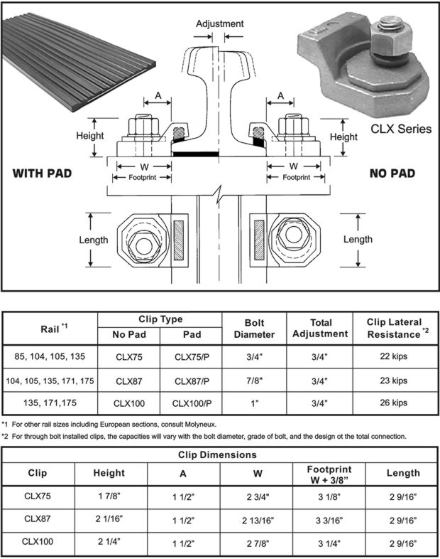 A single bolt adjustable crane rail clip that features a circular cam that locks the clip into position against the rail. The clip is designed and performs as a bearing connection. |