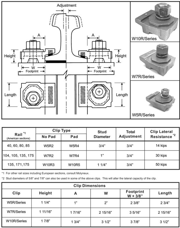 A single bolt adjustable crane rail clip that features a circular cam that locks the clip into position against the rail. The clip is designed and performs as a bearing connection. |